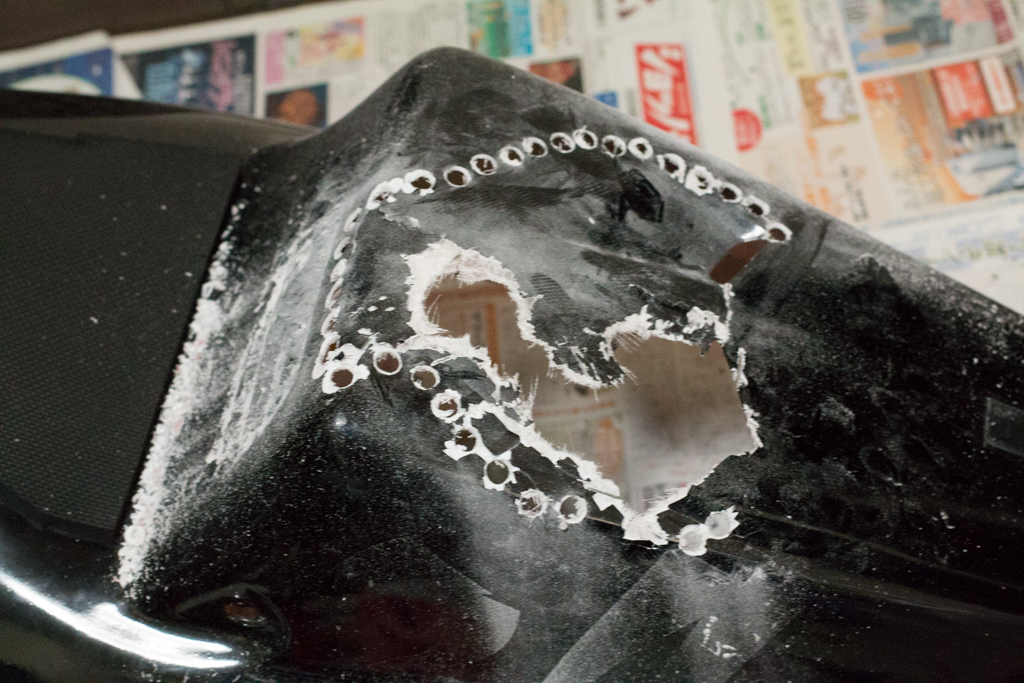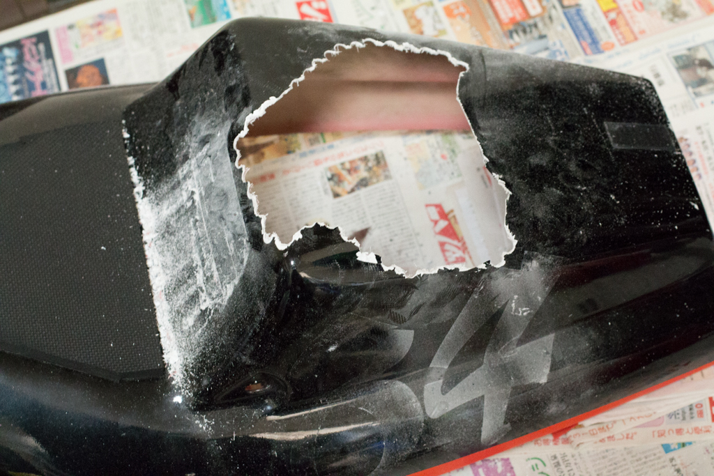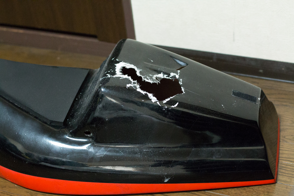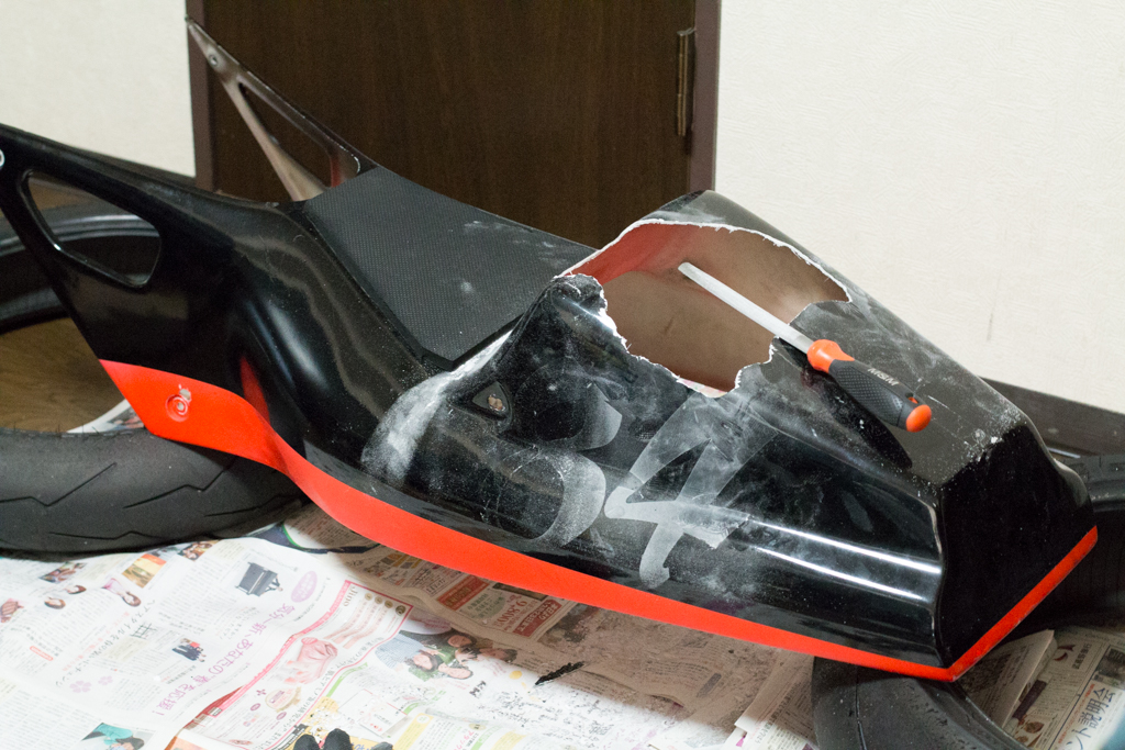そんでちょっと前に割れた部分を削り取ってFRPを貼り直そうと、リビングで電動ノコギリのスイッチを入れてみたらば、カウルの下側がスピーカーみたいになって共鳴してしまったり、割れてペラペラになっている部分がガシガシと暴れて、5分も経たないうちに苦情が来るレベルの騒音だったので断念したんです。