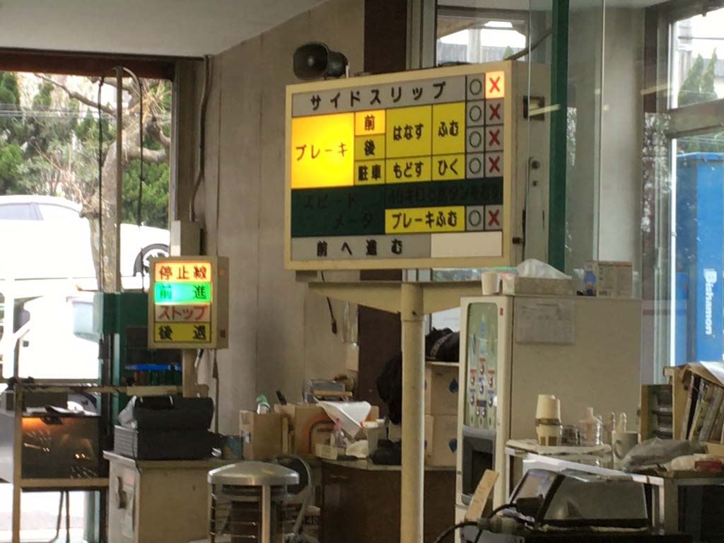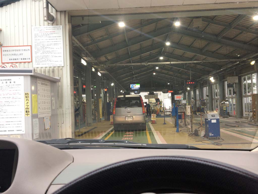 入口で『光軸とサイドなんとかと…あとなんでしたっけ??』というと、『全部ですね(笑)』ということで、2つあるレーンの右側に誘導してもらって、『まずはサイドスリップを見るのでゆっくり前進してください…もう一度測るのでバックして…はい、ゆっくり前進して…はい。サイドスリップダメですね(笑)っつって。