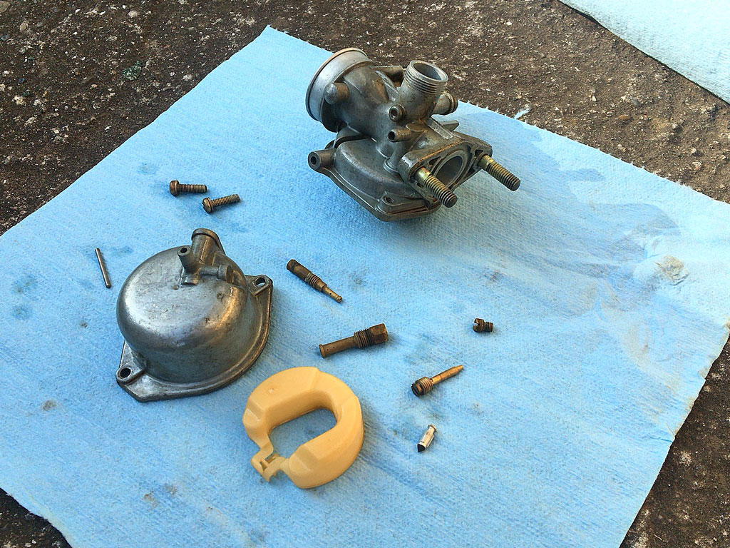 『むむ…4ミニのキャブってちゃんと弄ったことないから判らないけども、4ストのキャブってそうなの!?エアスクリューって最低でも1回転ちょい以上は戻すイメージがあるのだが…』と少し疑問に思いつつ、ひとまずお掃除。