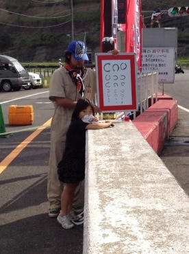 ふと見ると日光サーキット伝説の男の1人、CB-1こと浅野弟さんが何やら白いサインボードを使っています。