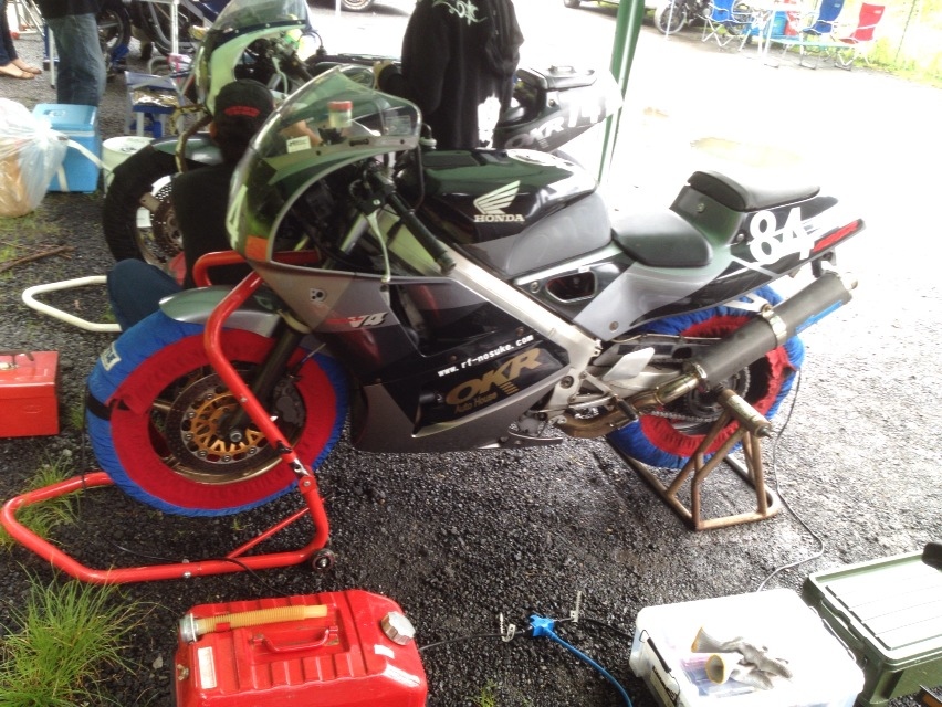 で、雨が降ったり止んだりなフルウェットコンディションでテンション下げ下げ状態で、GSX-R400RでPride 4に参戦するハットリと車検を受けたり受付をしたりしようってんで、ピットエリアに行って順番待ちをしていると駄目人間倶楽部の会長と遭遇!