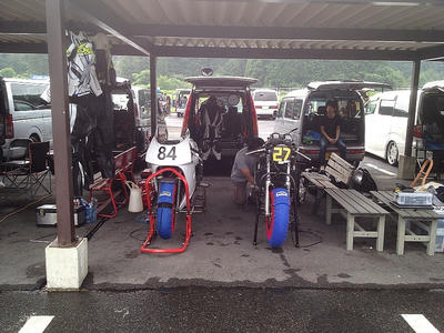 朝7時半くらいまではまったく降ってなくて、コースも渇き始めていたのだけど、8時過ぎからパラパラっと来て、そのまま降ったり止んだり。コースも濡れたり乾いたり。