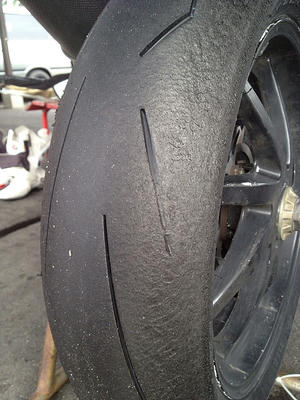 それも走行後に見てみたら、リアタイヤこんなんなってた。