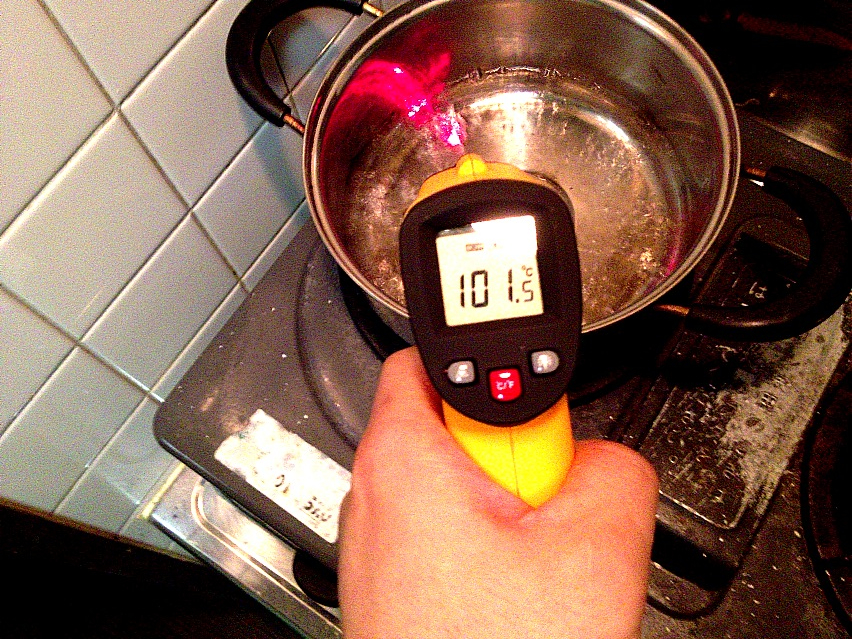 自分のお腹の辺りに向けてピピッとしたら35.7℃で、鍋に水を入れてお湯を沸かしてみたら、数値がグングン上がって行って、99℃とかそのくらいの数値が表示されたら沸騰し出したので割と正確なのかも知れない。