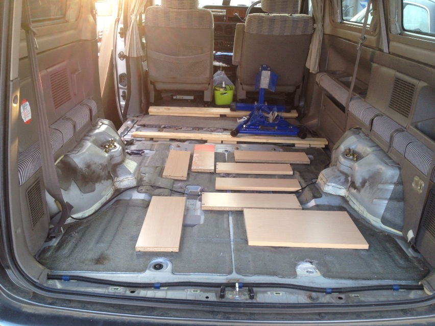 で、悪名高いステゴンの凸凹床なんですけども、初代トランポ、キャラBURNの床を作った時に余ってた材料と、昨日クローゼットの中をガサゴソしていたら、本棚の使ってない棚板を捨ててなかったヤツがたくさん出て来たので使うコトにした。