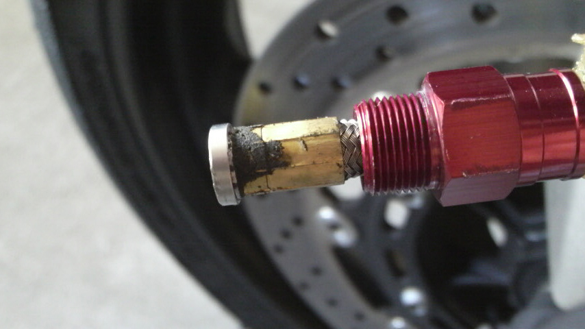 ウエスでバンジョー付近をキレイに拭いて、問題のフルードが滲んでたバンジョー部分を解体してみると、フルードが滲み出して中でホコリを吸って大変なコトになっていた。