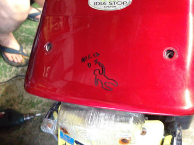 昨日OKRに社長の仕事の邪魔をしに行ったらハットリが何やらピットでいたずらしてたんですけども、何してたか?って言えば、通勤用のスクーターを弄ってた。
