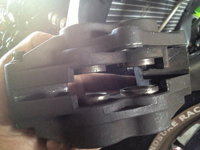 キャリパーを外して見るとピストンにだいぶ汚れが付着してて、そりゃぁ動きも悪くなりますよ…って。