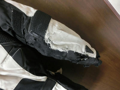 ジャケットを見ると両肩と肘の辺りに満遍なくダメージがあって、特に右の肘から手首に掛けての損傷が酷い。