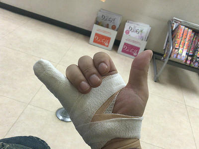 ハムのように美味しそうに見えたのは、一晩経ったら内出血が酷くて指全体が変色してたのと、パンパンに腫れてハムを縛ってる的なノリだったかららしい。