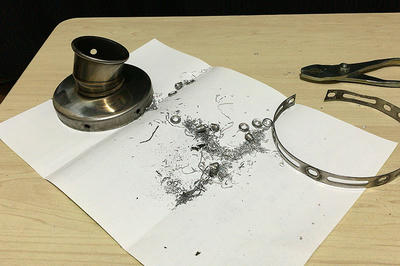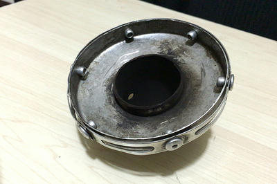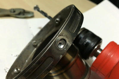 で、サイレンサーのパイプ側のリベットが留っていた穴は楕円に貫通してしまったのでその穴も開け直さないといかんのですけども、その前に今くっついてる元のリベットを取っ払わないとなりませぬ。