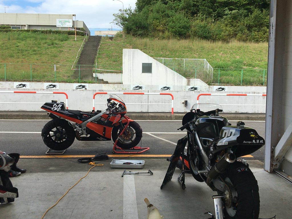 数周走ってすぐピットに戻って、症状を伝えつつ『この状態で走っても意味がない…』としょんぼりすると、一度ニードルの位置を元に戻すから、症状も元の1万2千RPMで足踏みする状態に戻るか確認してくれ!ってことで25分の走行時間の途中からニードルの位置を交換して残り数分でコースに戻してくれるという、凄まじい早業を見てビビった。
