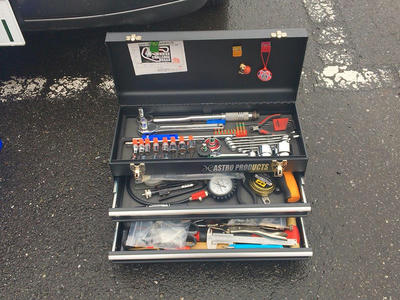大きさがだいぶコンパクトになるので、一番上は頻繁に使う工具、上段の引き出しにはちょいちょい使うものとサーキットでは出しっ放しにしていることが多いもの、下段の引き出しはあまり頻繁には使わないけどいざって時にないと困るものっていう分け方で入れて、入り切らないもので使わないものは降ろして、使うものは別の場所に移動しておいた。