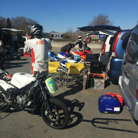 朝イチで千葉からYNORのボスが駆けつけてくれて、借りてるNSR50をハットリ号からのりは仕様の車体に交換してもらって、ファイナルを交換したり燃料を作ったりいろいろして、10時のミニバイク初級の2本目から走行開始。