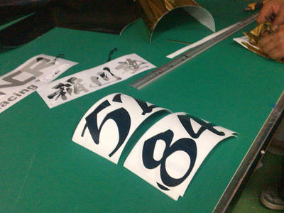 で、練習後はYNORのボスが懇意にしている本庄児玉のステッカー屋さん(Tシャツとかもやっていて工場内がワクワクスペース)に移動して決勝カウル用のステッカー制作。
