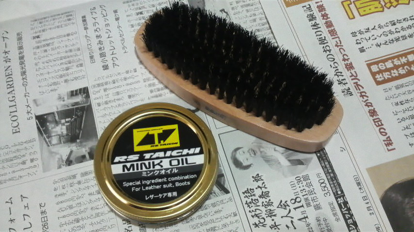 革靴用のブラシで擦って汚れを落として、普段ツナギに使ってるRS Taichiのミンクオイルを布で刷り込む。