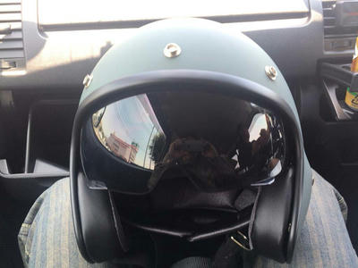 届いたヘルメットの実物が想像していたよりも可愛らしくてとても気に入った僕としては、ボスの車の助手席でヘルメットとグローブを装着してシールドを出したり引っ込めたりして遊んでいてご満悦だったんですけども、思いの外パイロットっていうか…ただの面白ジェットヘルだったかなって気もする(笑)