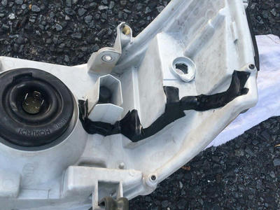 ちょっと判りづらいですけども、ヘッドライトのバルブの穴から右にほぼ一直線にバックり割れてるのが発覚。