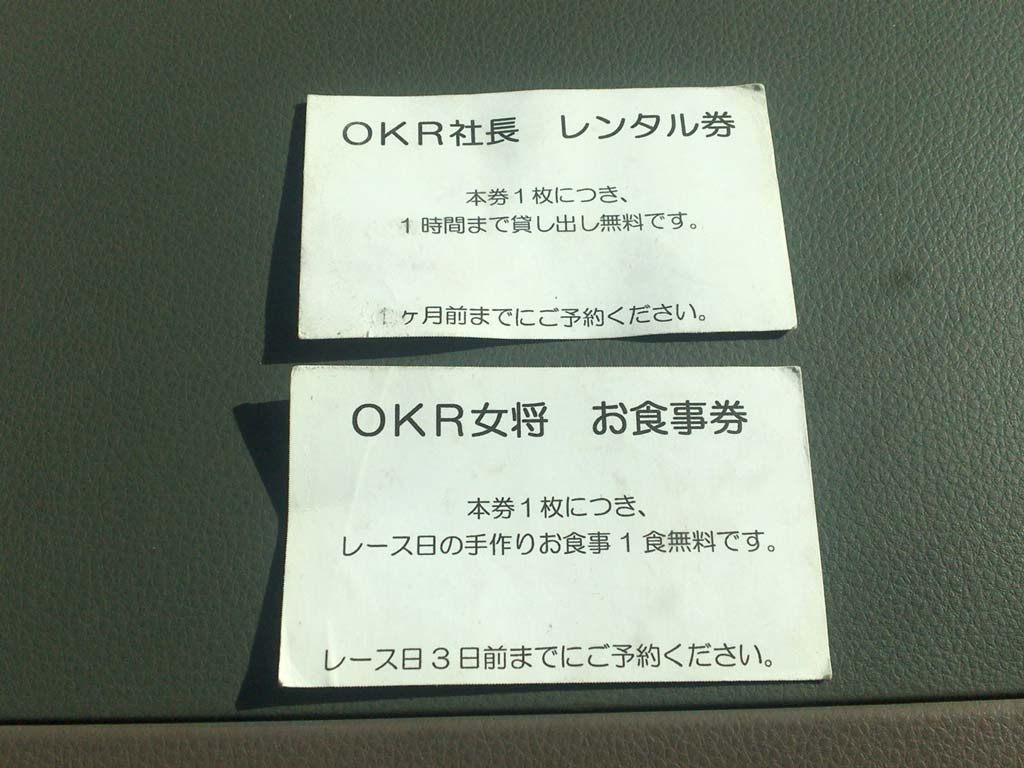 これは…ミニにタコ2014のKSRタイムアタック時の賞品にOKRから提供された社長の工賃1時間無料券と女将さんの手作りお食事券!!