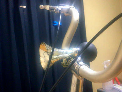 サーキットの移動用にいつも持って行っているちゃりんこ(ちゃりはし)にはトレードマークのラッパがついてるんですよね。