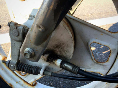 どうなってんだこれは…と思いつつ、メーターが動かないっていうとワイヤーが切れたんかな…と思ってまずフロントホイールの辺りをのぞき込んでみたら、これだ。