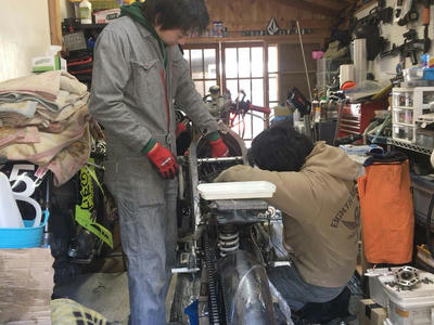 タラヲさんトコで冬場にバイクを弄る場合、少しでも暖かい場所で整備するためにタラヲさん所有の多数のバイクのうち何台かを表に出すのだけど、どうも見慣れない1台がとまっている。