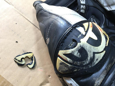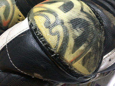 あとは洗濯するのに外しておいたプロテクター類を元に戻して終了なんだけども、背中、肩、肘、もちろんバンクセンサーも問題なかったのだけど、膝のプロテクターのウレタンっぽいところ、特に左側が崩壊してしまった。