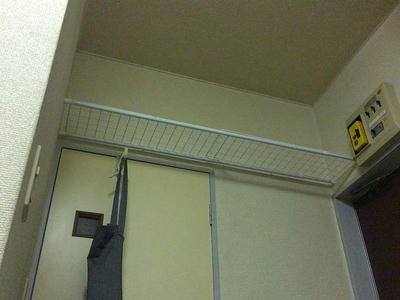 狭い部屋といえば空間を利用するというのがセオリーなので、調理道具なんかも可能な限りぶら下げるようにしてるんですけども、このデッドスペースを良い感じにしたら良いんでない??っつぅことで、100円ショップに行って丁度良い長さのつっぱり棒2本と網になってるのを2個買って来た。