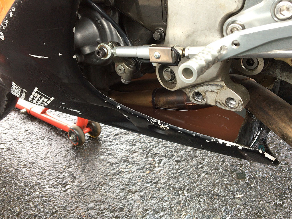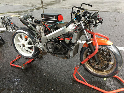 この段階で小雨は止まないし路面が乾くっていう可能性は限りなく低いと今日チャレサに参加してたほぼ全員が思っていたと思うのだけど、僕としてはやたらとテンションも高く、自分レプリカのプラモデルを作成するに当たって資料詳細写真を撮ろうとカウルを外していろんなところをパシャパシャしてた。