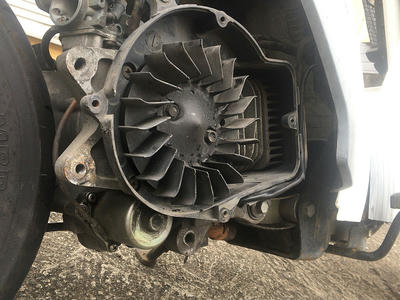 モーターを交換して配線もパチッと繋いで、スクーターのエンジンとはいえ、うっかり住宅地で直管なんて事態にならないようマフラーとエアクリボックスをくっつけてから、動作チェック!