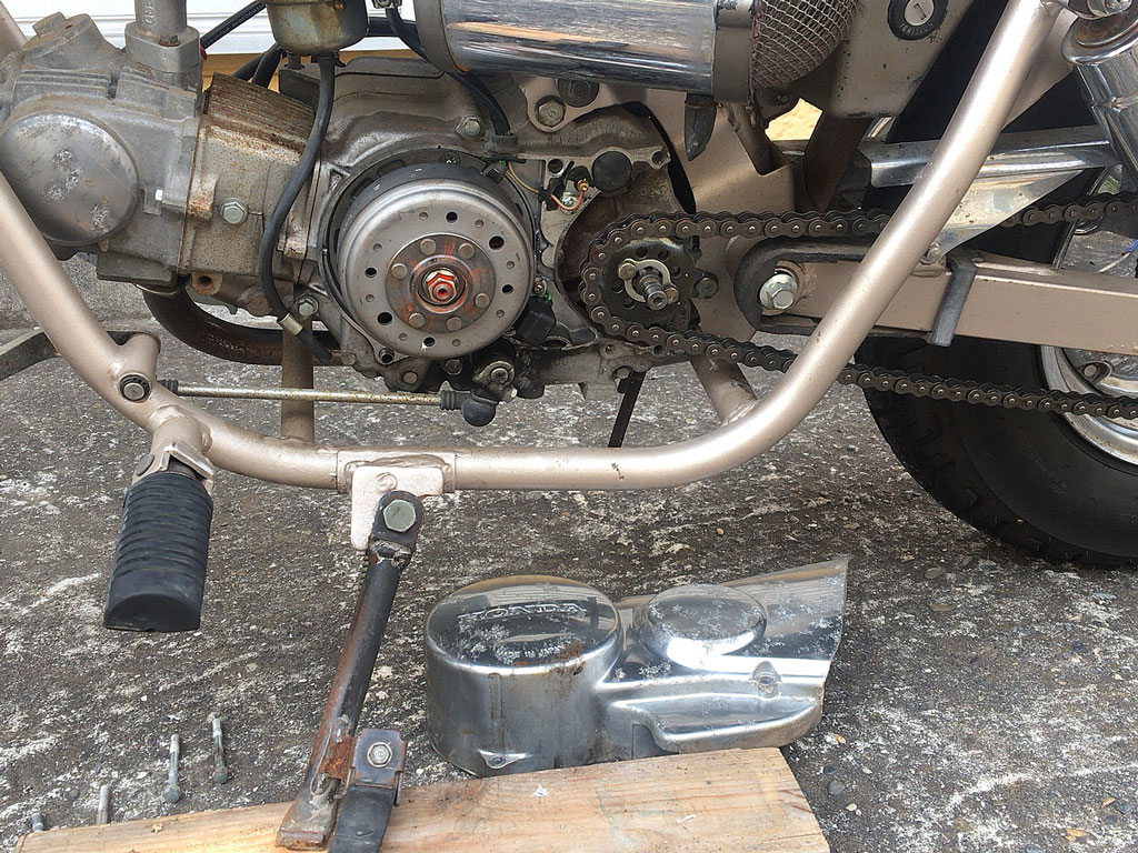 特に何か特殊な構造をしてるようには見えないな…と、ギアを入れてスプロケのボルトを2本抜いてプレートとスプロケを外す。