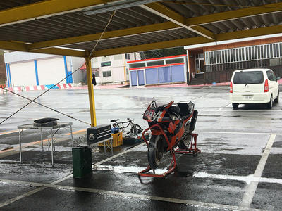 スプロケを交換したり、久しぶりにセッティングシートをつけたり、カメラやロガーをくっつけたり、車で居眠りしたり、そうこうしている内に8時半頃、相変わらず雨が降ったり止んだり。風が吹いたり吹いたり。