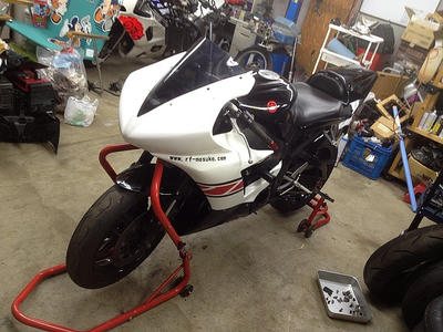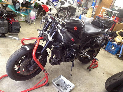 監督は今後のレースで走る予定(なのかな?)のバイクの整備、僕はR1をいじります。