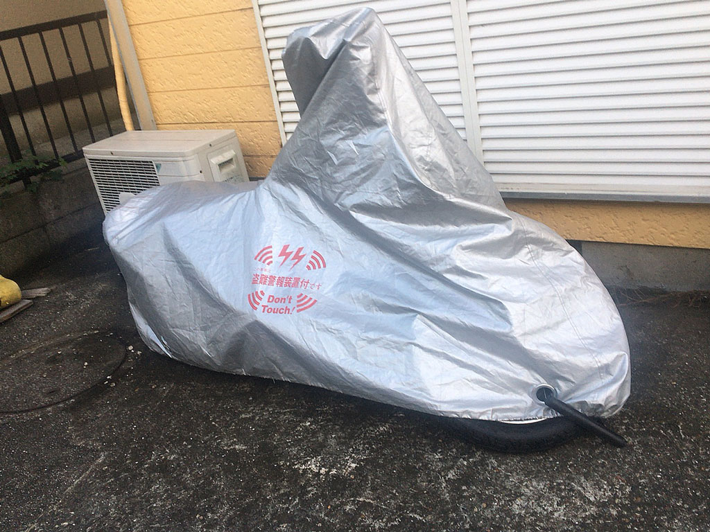 フロントはU字ロックをホイールに通してあるし、リアはU字ロックや紐の類をホイールに通せない代わりにカバーを掛けたあと少しバックしてリアタイヤでカバーを踏んである。