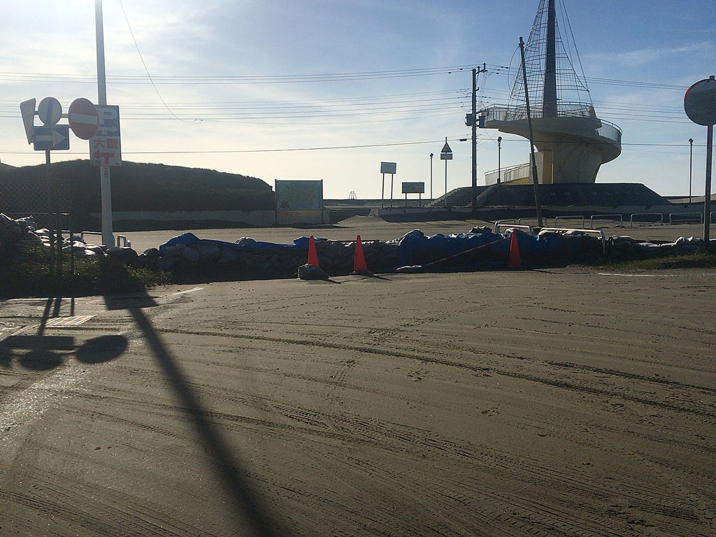 ここは多分台風対策だと思うのだけど、入り口に土嚢が積まれていて、駐車場には入れなかった。