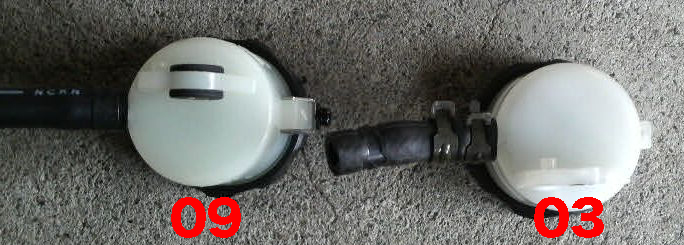 左が09ので右が03のリザーバータンクなんですけど、径と容量はまったく同じようだし形もほとんど同じなんですけども、取り付けのベースが出てる部分が前後逆なんですよコレ。