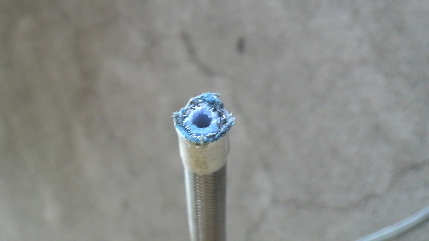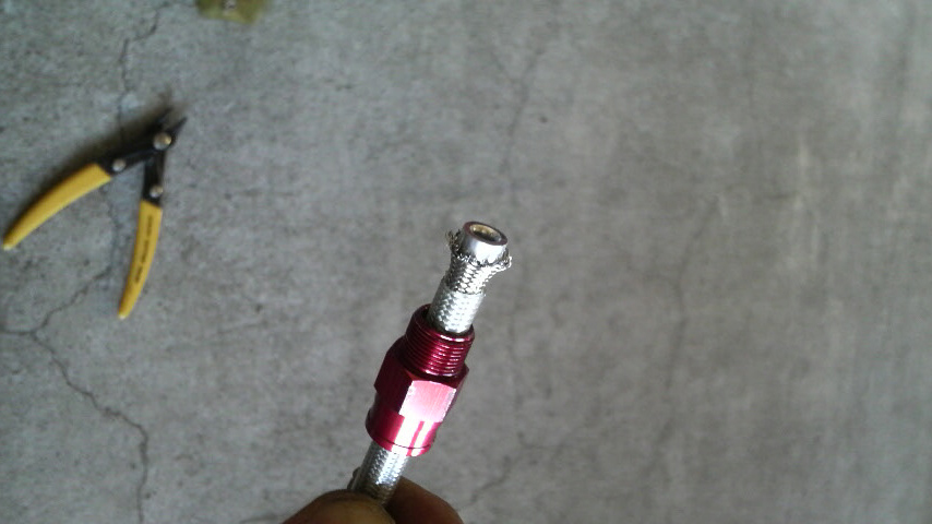 当然このままでは使える訳もないので、ビニールテープを剥がして中のテフロンホース部分をカッターで垂直に切り直して、メッシュ部分はニッパーで丁寧に剪定しましたよー。