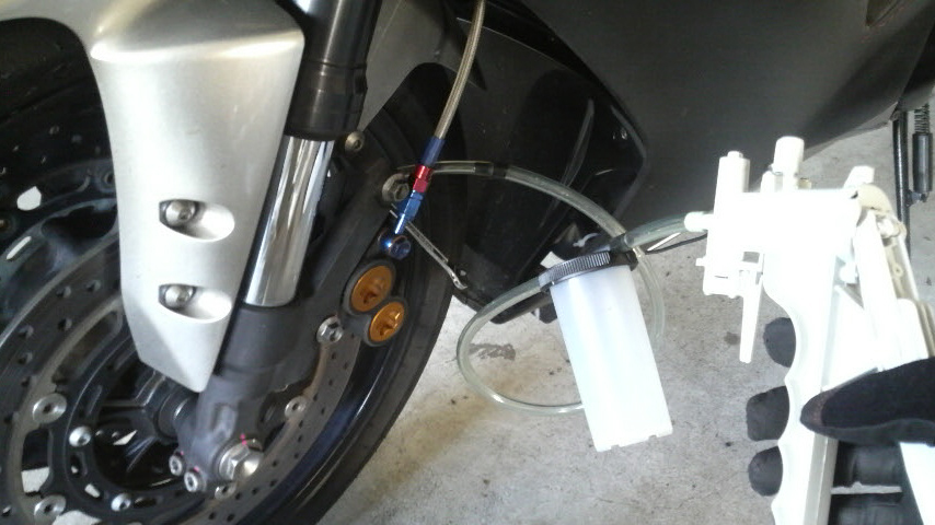 まず1度フロントホースを外すので、リザーブタンクの蓋を開けてエア抜きツールを使ってチューチューっと一気に抜き出す。