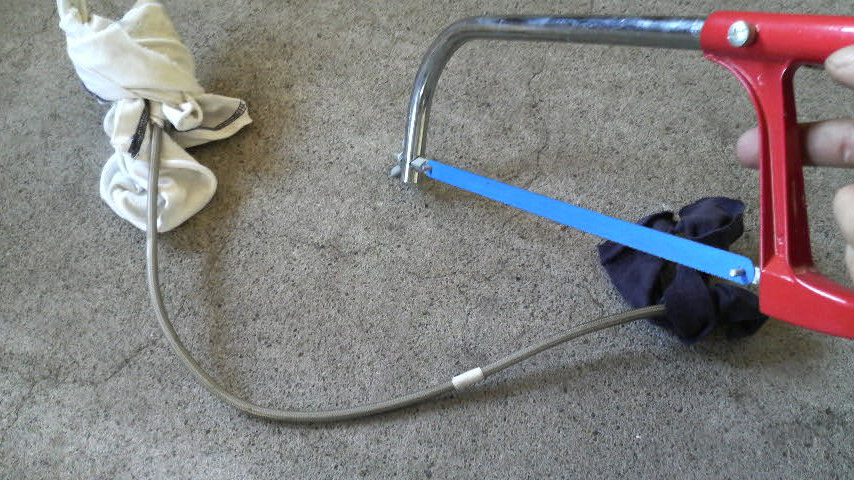 ホースの切断はグラインダーとかの高速カッターを使うらしいんですけども、グラインダーはおろかサンダーすら持ってない自分としては電ドルに刃をセットして切断…ってのはホースよりも先に指か何かを落としてしまいそうなので人力で攻めるコトに決定。