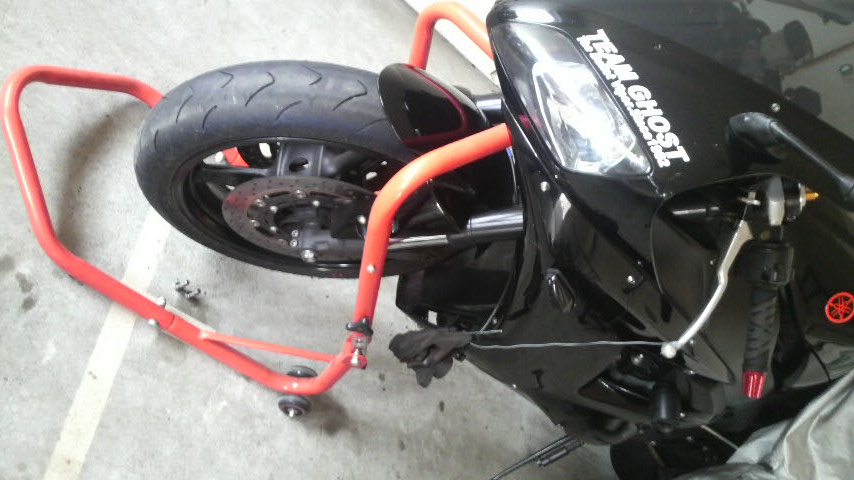 そんで、マンションで一人暮らしの自分としては、この上なくありがたいコトに、今日みたいに横殴りの雨の日ですら整備出来る駐輪場があるので、R1にフロントスタンドを掛けて持ち上げて様子を見てみる。