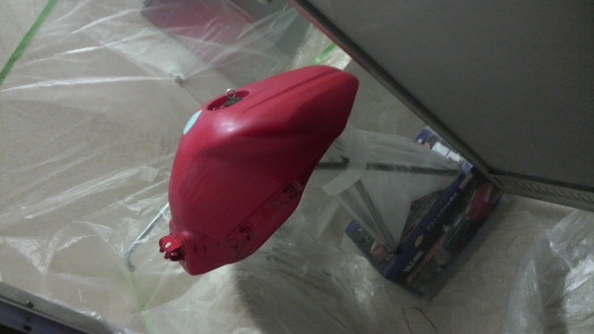 中身の入っていないタンクはそんなに重くもないので、カウル塗装と同じように適当な箱の上に椅子を載せて、その上にタンクを置いて塗った。