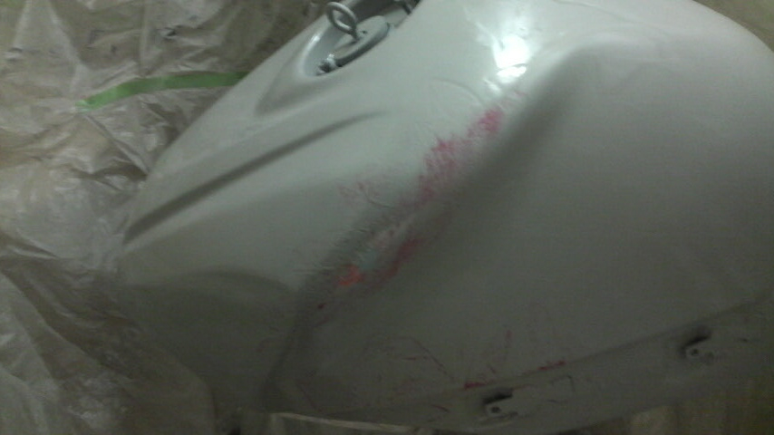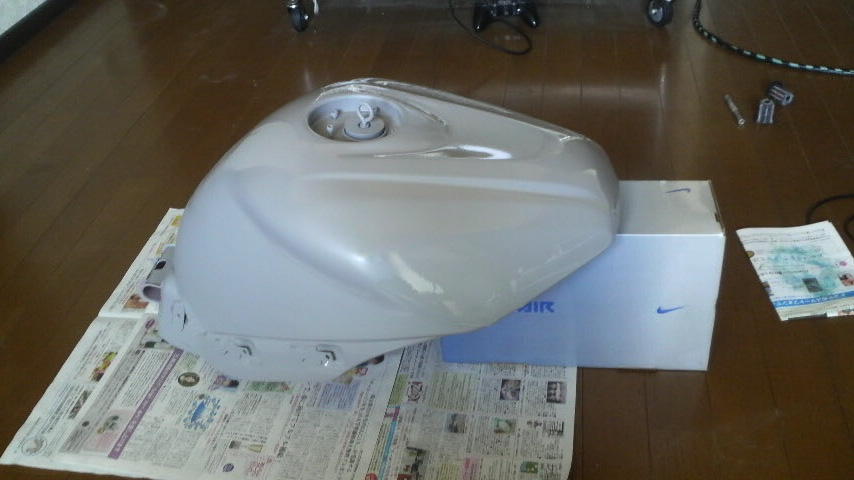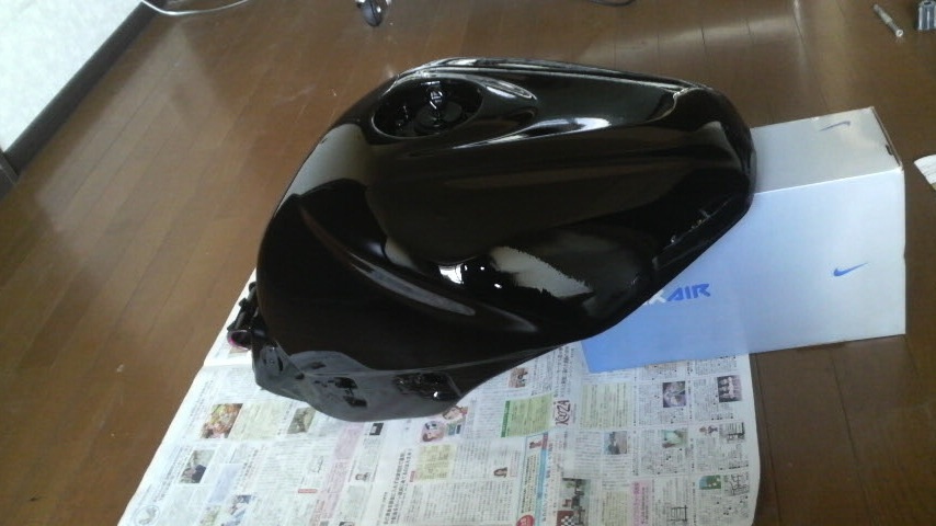 タンクに250番のペーパーで足付け後、水洗いして削粉を落として暖房を効かせた部屋で乾かす。