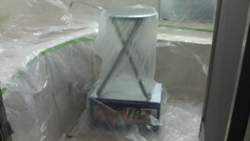 それから前回はスプレーするトコだけ養生すりゃぁ良いだろうと思って風呂の半分くらいが大惨事になったので、今日は換気扇以外をバッチリ養生してみた。