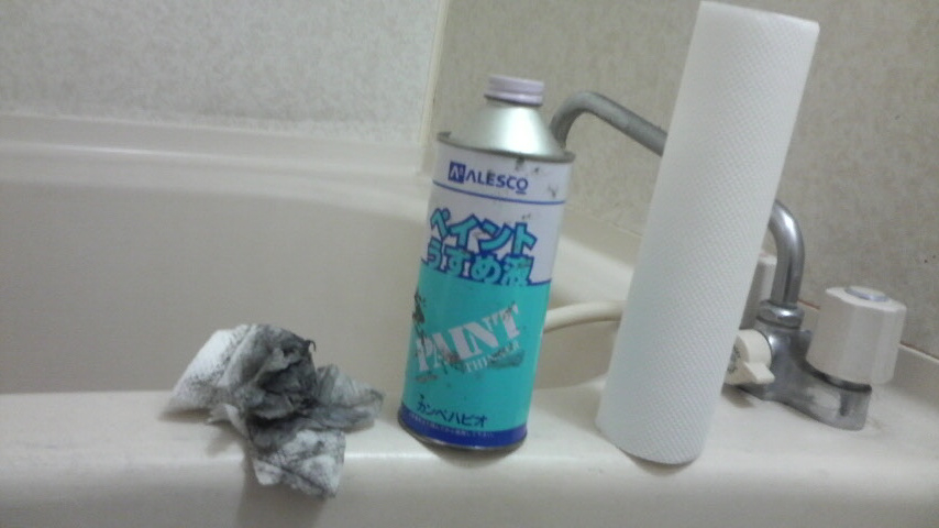 あとは前回養生してないトコに誤爆したスプレーの跡が気がかりだったので、ケミカル類を纏めてある棚をゴソゴソしたら出て来たペイントうすめ液でやっつける。