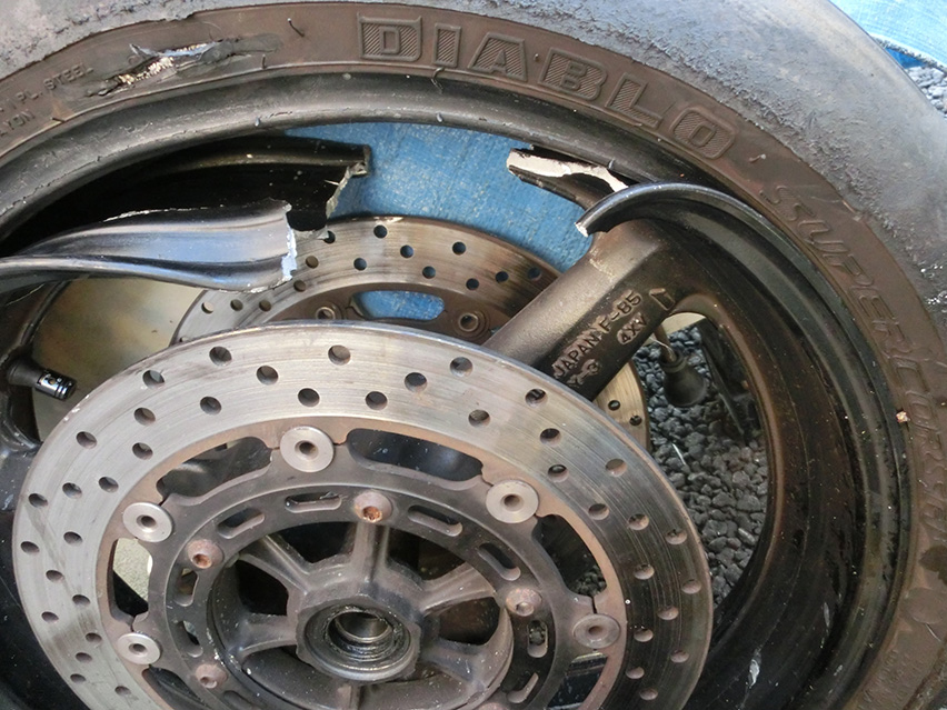 ホイールがバックリ割れて開いて、タイヤのサイドウォールが切れるっていうのはどういう衝撃が加わったんだろう…。