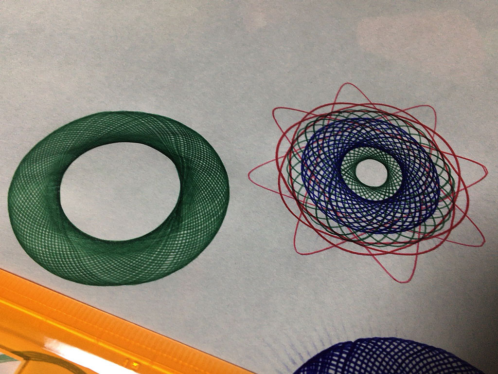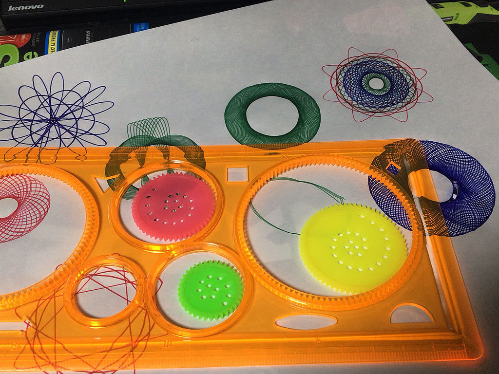 機能多めの定規みたいなやつに大きさの違うギアがついていて、ギアの組み合わせとギアの中の穴の位置で模様が変わるグルグルするやつ。