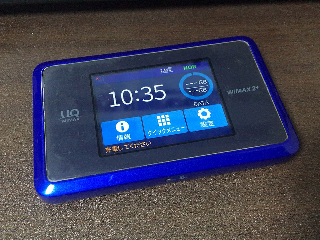 WX03を取り出してチェックしてみようとすると、本体の電源が落ちてバッテリー残量0%の表示。