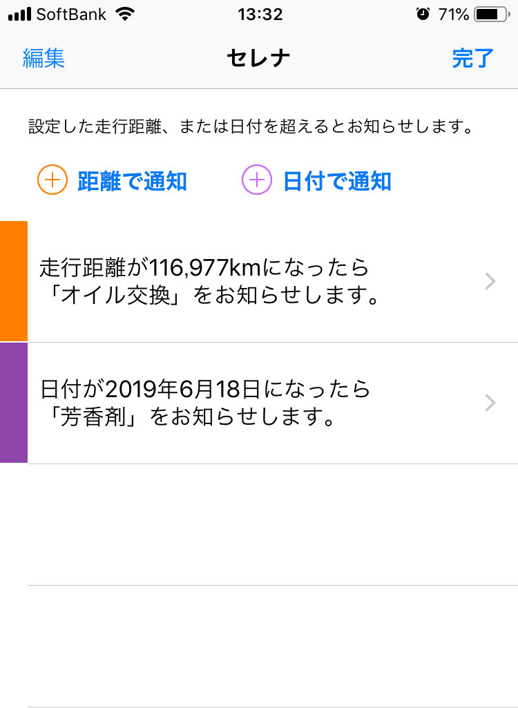 距離と日付で登録できるのだけど、セレナにはオイル交換時期を走行距離、芳香剤を日付で登録してある。