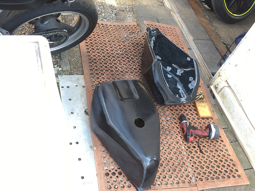 そんで、至福の時を過ごしたら鬼装改のガレージに戻って今僕のVFRについてるFRPのタンクカバーを、試作の試作から、試作品に交換してもらった。
