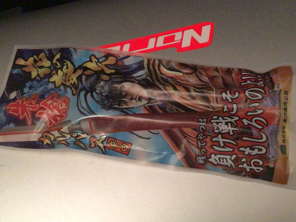 特に急ぎでもなかったのでなんとなく建物の中を散策していると、花の慶次の名言がプリントされた朱槍が売っていた。
